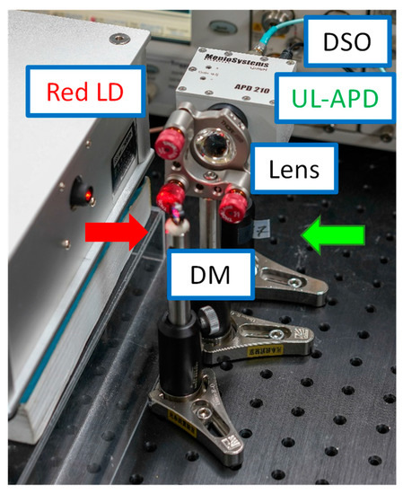 Experimental photographs of the CO. Red arrow—red light; Green arrow-green light; APD—avalanche photodetector; DSO—digital sampling oscilloscope; DM—dichroic mirror.