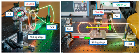 Figure 6a–c illustrate the photographs of the LDOF without, with the red light, and with the green light launchings, respectively. We can observe uniform light around the fiber circumference in all cases. The optical signal emitted via the LDOF is safe for human eyes. We purposely make turns in the LDOF to illustrate the flexibility of the LDOF as an optical omni-directional antenna. Figure 7 illustrates the experimental photographs of the CO, in which a directly modulated red LD is used to provide the DL data and an APD is used to receive the UL green data. The DM is used to separate the red DL and green UL signals from the wavelength multiplexed signal, and a lens is used to focus the UL signal into the APD. Figure 8 illustrates the experimental photographs of the client side at different viewing angles. Two collimators at each side of the LDOF are used to couple optical signals into and out of the LDOF. The client APD mounted on a sliding stage can slide along the whole LDOF to receive the DL signal. As discussed above, we purposely make turns in the LDOF to illustrate the flexibility of the optical antenna. The yellow color emitted via the LDOF can be observed when both red and green lights are launched and combined in the LDOF.