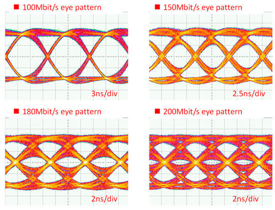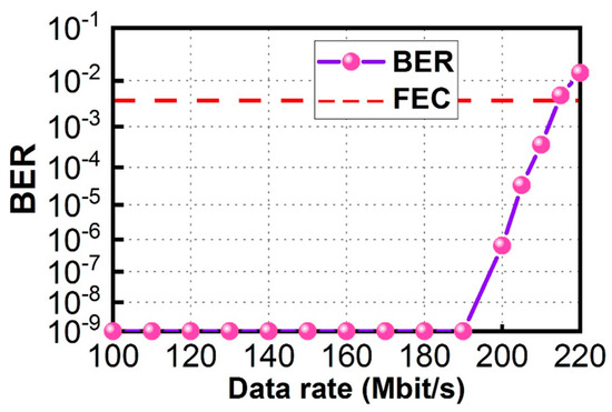 Figure 9 shows the DL BER measurements via the LDOF from data rates of 100 Mbit/s to 220 Mbit/s measured at the client side. From a data rate of 100 Mbit/s to 190 Mbit/s, it is error-free. The BER starts to increase at a data rate of 200 Mbit/s, and the BER is 6.50 × 10−7. BER of 3.69 × 10−4 is measured when the DL data rate is 210 Mbit/s, satisfying the 7% pre-FEC threshold (BER = 3.8 × 10−3). Figure 10 shows the corresponding received DL OOK eye diagrams at different data rates. Clear eye diagrams can be observed at data rates up to 180 Mbit/s.