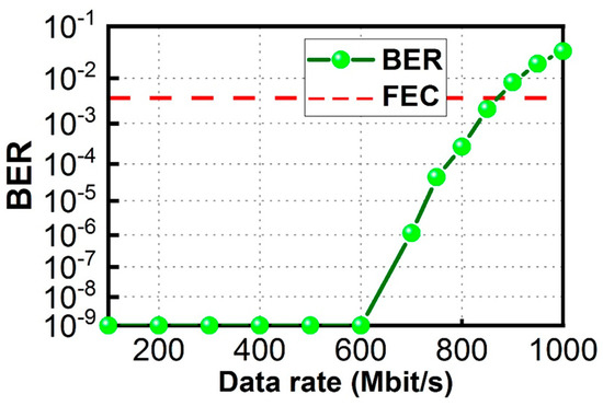 Figure 11 shows the UL BER measurement from data rates of 100 Mbit/s to 1000 Mbit/s measured at the CO. From a data rate of 100 Mbit/s to 600 Mbit/s, it is error-free. The BER starts to increase at a data rate of 700 Mbit/s, and the BER is 1.14 × 10−6. The BER of 2.15 × 10−3 is measured when the UL data rate is 850 Mbit/s, satisfying the 7% pre-FEC threshold. Figure 12 shows the corresponding received UL OOK eye-diagrams at different data rates. Clear eye diagrams can be observed at data rates up to 800 Mbit/s.