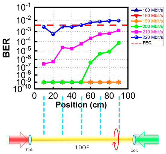 Figure 13 shows the DL BER measurement curves at different data rates and at different positions of the 100-cm LDOF optical antenna. We can observe that at data rates of 100, 150, and 190 Mbit/s, error-free detection can be achieved at positions from 10 to 90 cm even when the light is not quite uniform along the LDOF, as shown in Figure 4. At data rates of 200 and 210 Mbit/s, we can observe that pre-FEC BER detection (BER = 3.8 × 10−3) can be achieved for the whole range of LDOF, with the highest BERs measured at 90 cm locations with BER = 7.60 × 10−5 and 1.30 × 10−3, respectively. In Figure 13, we can observe that BER = 1 × 10−9 can be measured by our BER tester (Anritsu®, MP1800A) at data rates from 100 Mbit/s to 190 Mbit/s. BER = 1 × 10−9 can be considered error-free. Here, we would like to illustrate that if we use a low DL data rate of <190 Mbit/s, error-free detection can be achieved for the whole 1-m long LDOF. If we want to use higher data rates of 200 Mbit/s and 210 Mbit/s, FEC performance (BER = 3.8 × 10−3) can be guaranteed. However, when the data rate is increased to 220 Mbit/s, only half length of the LDOF can satisfy the FEC transmission.