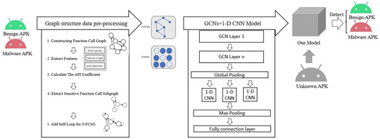 In this paper, we extract the function call graph (FCG) from a decompiled APK, which could automatically capture the semantic relationships between different functions and extract three types of features from each function as node features based on the newest API permissions and graph structure. Then, we calculate the API coefficient that can represent the importance of each API and extract the sensitive function called subgraph (S-FCSG) based on the API coefficient ranking. The S-FCSG reduces the number of nonsensical nodes, maximizes the retention of node features, and avoids the convergence of important node features into meaningless node features during the forward propagation of the GCN model. Finally, we add the self-loop to each node of the S-FCSG and feed it into the GCN model so that the node features can compute themselves again during the aggregation of node features, increasing the difference of features between different nodes. Three 1-D convolutional neural networks with different convolutional kernel depths extract further correlations between node features, and fully connected layers are used for the final classification. Our experimental results show that our approach has an accuracy of 98.28%; therefore, our approach is effective. The contributions of this paper are as follows: