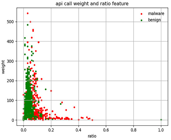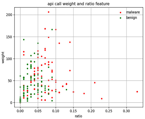 In Assessment 2, we find 300 samples (150 malware and 150 benign) of similar size from 2000 samples and calculate the sum of the API call weight and the ratio of those samples, as shown in Figure 5. Normally, In the case of the same weight value, the ratio value of malware is greater than benign, and in the case of the same rational value, the weight value of malware is greater than benign. Therefore, malware’s weight value and ratio value are generally greater than benign.