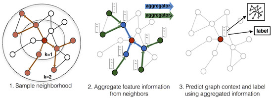 - Hamilton, W.L.; Ying, R.; Leskovec, J. Inductive Representation Learning on Large Graphs. In Proceedings of the NIPS’17, 31st International Conference on Neural Information Processing Systems, Red Hook, NY, USA, 4–9 December 2017; pp. 1025–1035. [Google Scholar]