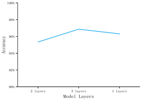 During our experiments, there were many parameters that influenced the outcome of our experiments. The first was the number of layers of the GCN model. We started our experiments with a two-layer GCN model because of the recommendation made by Hamilton et al. [32]. The different node features in the S-FCSG gradually converged to be similar to the GCN model that was continuously trained. This does not mean that more layers in the GCN model were better in our approach. We tested the effect of the GCN model with two, three, and four layers on our experimental results. We observed that the detection accuracy of the model with three layers was higher at K = 20, as shown in Figure 15.