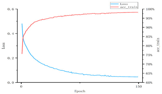 In Table 5, we find that when the number of layers of the GCN model is low, the larger the K-value, i.e., the larger the dimensionality of the node behavior features, the better the results. However, this phenomenon is no longer evident as the number of model layers increases. As the number of layers of the GCN model increases, the accuracy of the model detection is higher at K-values of 20 and 40 than when the number of layers of the GCN model is two. This may be because the node features have not yet fully aggregated the features of neighboring nodes in two layers of the GCN model, and the model cannot correctly identify the APK category at low feature dimensions. However, when the value of K is 60 when the multi-layer GCN model is used again to aggregate node features, the features may overlap, and the features used lose their original importance, causing interference in the model detection and making the final result inferior to that of the two-layer GCN model. By our experimental comparison of different model layers and K-values, the GCN model has the best results in our approach when the number of layers is three and K = 40, with an accuracy of 98.28%. The epoch of our training process is set to 150, as shown in Figure 16 for the experimental process with GCN model layers of three and K of 40. When the epoch reaches 150, the loss function curve and the training accuracy curve have fully converged.