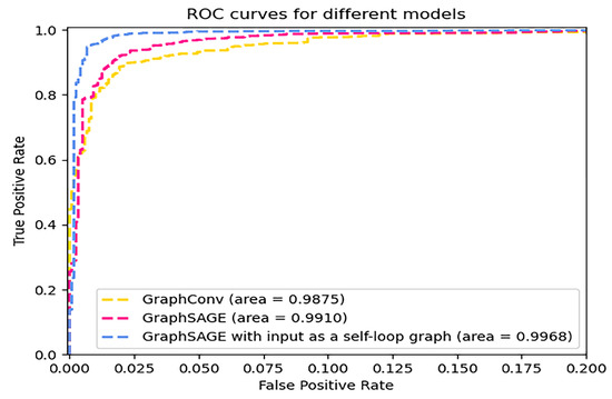 Under the same parameters of the model, we compared the results of GraphConv [31], GraphSAGE [32], and GraphSAGE with input as a self-loop graph, as shown in Figure 17. The ROC plot shows that the classification effect of using the GraphSAGE with input as a self-loop graph is higher than the other two models, which shows that we can effectively enhance the important node features by adding self-loop to the S-FCSG and improve the classification performance of the original model.