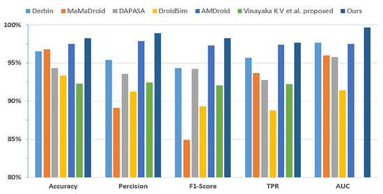 We evaluated our model using standard metrics, such as accuracy, precision, F1 score, TPR, FPR, and AUC. These metrics were calculated as Equation , , , , , and is the area under ROC curve. In the above equations, denotes the counts of malware correctly detected, denotes the counts of benign APKs incorrectly classified as malicious, denotes the counts of benign APKs correctly detected, and denotes the counts of malware APKs incorrectly classified as benign.