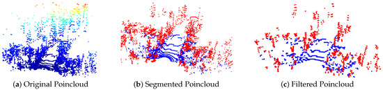 A pseudo-code describing the pre-possessing is available in Algorithm 1. The algorithm first performs intensity-based filtering to remove points belonging to foliage, followed by a ground segmentation using an Approximate Progressive Morphological Filter [39] implemented using PCL’s libraries [40]. The segmented pointcloud has a substantial amount of noise due to the rough terrain of the forest and must be refined further by employing an additional filtering step. The outliers are detected using the point’s normal direction (estimated using adaptive radius search parameters) and the minimum number of neighbors in the point’s vicinity.