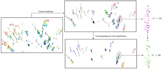 Figure 3 demonstrates the result of coarse clustering, refined clustering, and heuristic-based classification step, and the pseudocode of the proposed tree-stem segmentation algorithm is given in Algorithm 2. Details on each step are as follows.