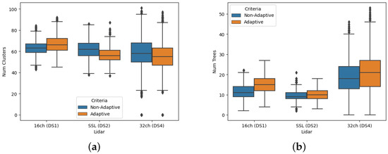 Box plots showing the effect of the adaptive approach on (a) the number of clusters detected and (b) the tree detection for different Lidar sensors. The number of detected trees is higher for the adaptive approach, which results from more accurate normal estimation and pointcloud filtering.