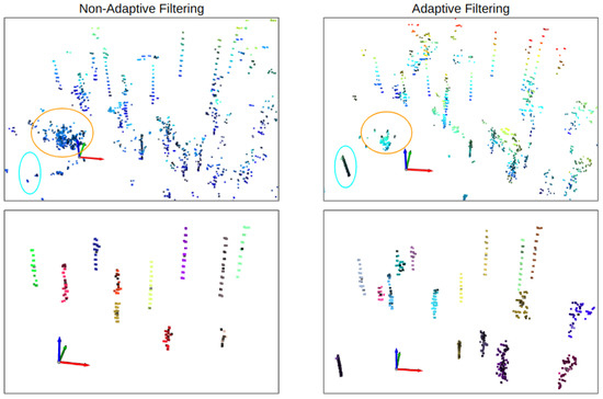 Visualization of the effect of adaptive and non-adaptive filtering approaches on tree segmentation for a single pointcloud scan of 16-channel LiDAR scan in natural forest. The noise for non-adaptive filtering is prominent near the sensor compared to the area far from the sensor—this noise results in incorrect clustering and fewer detected trees as shown in the bottom row.