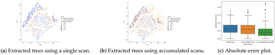 Figure 7 shows the absolute error boxplot between the estimated tree diameters and ground truth DBH. From the plot, we can see that the absolute error for tree diameter estimation is less for combined scans than tree diameter estimation from a single scan due to more points for the detected trees, which results in more accurate tree position and diameter estimation compared to ground truth.