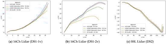 Table 2 reports the RMSE error for the LiDAR odometry generated using FPFH-based registration and tree-feature-based registration, along with the tree-based pose graph SLAM approach, which is compared using the trajectory generated by the LIO-SAM approach. We can observe that the tree-feature-based registration outperforms FPFH-feature-based registration for low-resolution LiDAR sensors (16ch LiDAR), with a decrease in RMSE by over 3 m (from 5.9 m to 2.6 m for DS1-v1 and from 8.9 m to 3.3 m for DS1-v2). However, for the solid-state LiDAR sensor, the RMSE from both methods is almost similar. The trajectories from these methods are also shown in Figure 8.