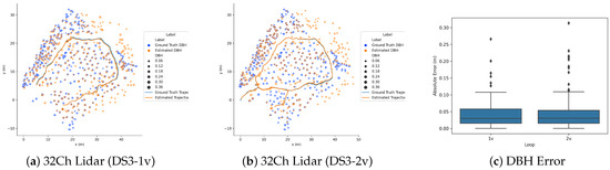 Figure 9 show the position of detected trees and the estimated DBH for the complete trajectory. The number of tree correspondences found for a DS3-1v is only 90, much lower than those found for DS3-2v 156. The MAE of DBH estimation for the tree correspondences is 4.4 cm (RMSE = 6.3 cm) and 4.3 cm (RMSE = 6.5 cm) for DS3-1v and DS3-2v, respectively, and the corresponding absolute DBH error plot is given in Figure 9c.