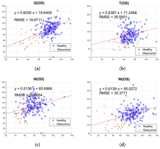 The next analysis is devoted to check any relationship between the value of the rim width in each sector extracted from retinographies and the RNFL thickness in the corresponding sector of the OCTs. Figure 4 shows these plots, using as representative the values for sectors T, N, TI, and G. In these plots, the linear regression model which better fits the cloud of points is indicated, as well as the RMSE (Root Mean Square Error) of the fit.