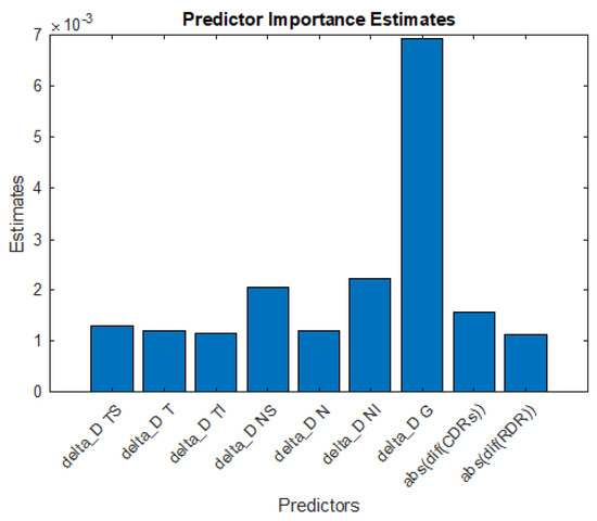 As can be seen, appears to be more effective than for patient characterization, given that better classification metrics are obtained for both healthy patients and those with glaucoma. We also note that including both parameters provides a worse classification capacity. It is then interesting to consider which of the previous characteristics are most relevant. These will be referred to as Most Significant Parameters, MSPs, to the most discriminant information. Figure 6 shows this result, obtained by averaging the relevance of each sector returned by the model in 1000 different decision trees. The most informative sectors for the algorithm are the TS, NS, NI, and mainly the global sector G. We also see a higher weight of the parameter over . The results of employing only these metrics are shown in Table 4.