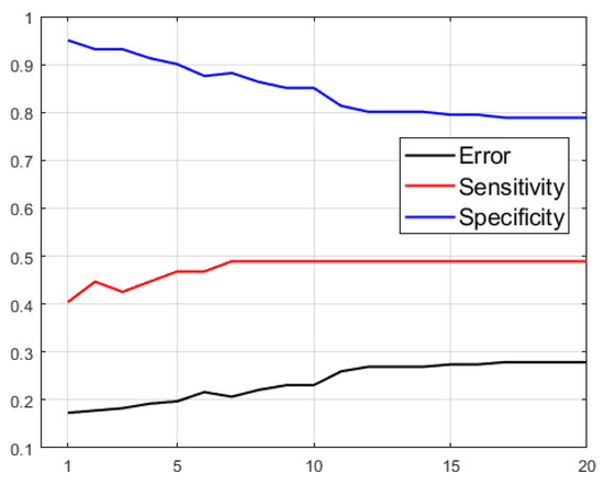Generally worse results are obtained when selecting only the best sectors of the asymmetry metric compared to models with all sectors. Nevertheless, better results are also obtained by adding to these parameters the instead of the , although the metrics worsen compared to not using either of them. The results indicate that the worsening of the models when using more features is due to the “confusion” caused by certain features on the decision algorithm. In order to optimize the design of the decision trees, we conducted a study of its hyperparameter “Maximum Number of Splits” (MNS), which limits the growth of the tree to reduce the overfitting of the model to the training data. Figure 7 shows the evolution of the metrics obtained using extracted from retinographies according to the maximum number of splits (MNS) allowed. In terms of accuracy, the minimum error is obtained when the maximum number of splits is restricted. Model performance worsens when the maximum number of splits is not limited, as the tree considers more and more patient features and tends to overfit to the training set values, thereby impairing its generalization ability and correct classification of new patients. This improvement is reflected in the characterization of healthy patients (specificity), increasing from 78.9% (in the non–restricted case, which coincides with the restriction of MNS = 20) to accuracy values above 93%. However, the correct classification of patients with glaucoma (sensitivity) is slightly reduced from 48.9% to values around 43%, which hardly deteriorates the most relevant metric of this study.