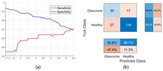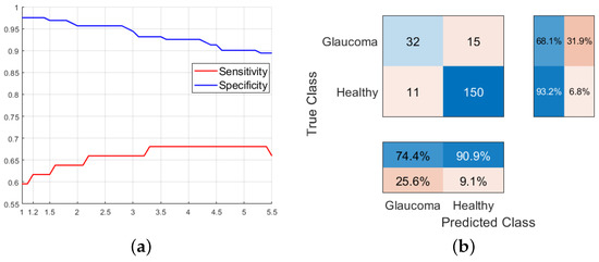 (a) Evolution of the sensitivity and specificity of the SVM model generated using all the metrics extracted from retinographies as a function of . (b) Confusion matrix of the SVM model using all the features from retinographies with .