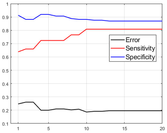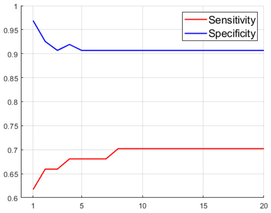 Once the best features have been selected, we now seek to improve the resulting metrics through the hyperparameter “maximum number of splits” (MNS). As seen in Figure 10, limiting the maximum number of divisions improves the classification of healthy patients, with accuracy rates above 90.7%, while it worsens the sensitivity of the model, which falls below the 70.2% obtained without limiting the growth of the tree.