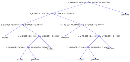 In order to examine the impact of selecting the most relevant sectors of the best asymmetry metric, the relevance of each sector has been extracted by averaging 1000 decision trees. For , the sectors TS, TI, NI, and G are selected to be the most significant parameter (MSP), while for we will employ TS, TI, NS, and G, in order to consider in both cases some features of both the nasal and temporal sectors of the eye. The performance of the models obtained using only these features is presented in the last two columns of Table 6. Models obtained from the highest–weight sectors allow for improved patient classification, being the best decision trees up to this point, correctly classifying 72.3% of glaucoma patients and over 90% of healthy patients.