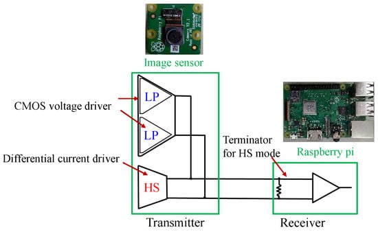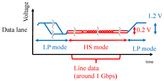 The MIPI is a standard interface used in the cameras and displays of mobile devices, and the MIPI physical layer (D-PHY) is often used for the camera and display serial interface. The MIPI is configured with a one-clock lane and one or more data lanes. The MIPI data lane switches between the HS mode with a differential 0.2 V signaling for data transfer and the LP mode with single-ended 1.2 V signaling for control and handshake data, as shown in Figure 3. Image data are transmitted in a row-by-row fashion during the HS mode, in which the data rate in our experiment was around 1 Gbps.