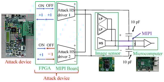 In this work, we used our previously proposed method [13,14] to attack the MIPI. A block diagram of the attack device is shown in Figure 5, where the image sensor and MCU (Raspberry Pi), which are the victim devices, are on the right side, and the MIPI connects them. From the attack device on the left side, a fault attack signal is injected into the two differential channels of the MIPI through 10 pF capacitors. The attack device has two HS drivers, and the attack state (deactivate or activate) is controlled by the attack signals generated on an FPGA.