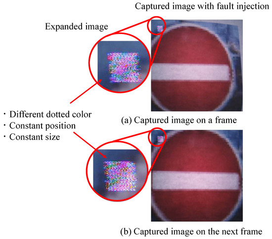 The MIPI has a high-speed (HS) mode and a low-power (LP) mode. Image data were transmitted at a high frequency in the HS mode, and image data were not transmitted in the LP mode. The attack signal was superimposed on the image data in the HS mode to add the adversarial marks in our experiments. In this paper, we present the results of an experiment conducted with medium-resolution (120 × 120) color images. Previous reports [13,14,15] have not analyzed the extent to which the image data are tampered with. We set the image tampering model and used the poison data that are close to the pattern generated in the actual situation.