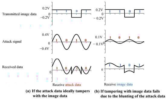 Because the image and attack signal in this experiment are of a high-frequency waveform of 960 MHz and 500 MHz, the signals may become blunt, and the amplitude may be smaller than expected. Figure 9 shows a schematic diagram for a scenario in which the amplitude of the attack signal is blunted. The received data are set to 1 if the signal is positive and 0 if the data are negative. The value of the received signal is defined by the value at the time when the image data were captured. As shown in Figure 9a, the received data successfully carry out tampering in the ideal situation when the amplitude of the attack signal is doubled and the phase is synchronized. Figure 9b shows the signal when the amplitude of the attack signal is half that of the image signal. We confirmed that the transmitted image data were received and that the tampering failed.