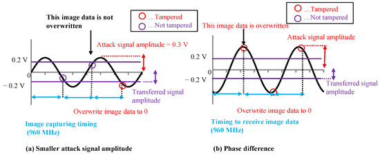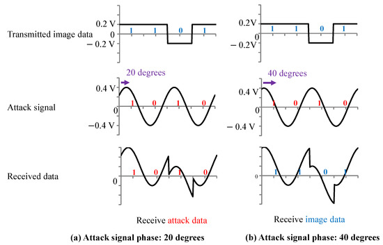 In addition, the timing of the attack signal and the image signal could not be synchronized in the experiment. Therefore, it was assumed that there was a phase difference between the attack signal and the image signal. Figure 10 shows the signals when the phase difference between the attack signal and the image signal is 20 degrees (a) and 40 degrees (b). When the phase difference is (a) 20 degrees, the attack signal is received, but when the phase difference is (b) 40 degrees, the attack signal tampering fails, and the transmitted image data are received. Thus, tampering of the image signal may fail depending on the phase difference between the attack signal and the image signal.