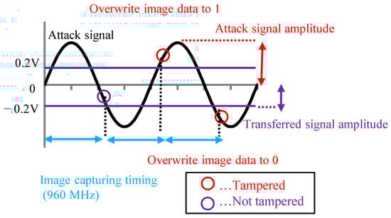 By looking at Figure 9 and Figure 10, we can deduce that the amplitude and phase difference are important parameters for tampering with the image data. Therefore, to create the image data tampering model, it is necessary to set parameters related to the amplitude of the attack signal and the phase difference between the attack signal and the image signal. We created the image data tampering model shown in Figure 11. The transmitted image data were captured with a 960 MHz clock, and the attack signal was superimposed with a 500 MHz clock. If the attack signal is greater than the image signal value (0.2 V) when the image signal is captured, the image data are overwritten with 1. If it is −0.2 V or less, the image data are overwritten with 0.