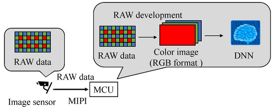 Figure 13 shows the sequence of image data processing. The image sensor transmits the image data through the image sensor interface as RAW data. Our fault injection attack on the MIPI tampers with the RAW data. These RAW data are arranged in a Bayer array. In the Bayer array, the 2 × 2 pixels have pixels representing red, green, and blue, and the two green pixels are arranged diagonally. The RAW data were converted to an RGB image by using RAW processing (black level correction, demosaic processing, white balance correction, color matrix correction, gamma correction, etc.) and then input into the DNN. RAW processing was applied to the RAW data obtained from Raspberry Pi using an algorithm [23]; the same processing was also performed in the simulation of the tampering pattern.