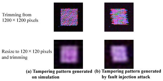 Additionally, the patterns of the two were slightly different. As a pre-processing step in DNNs, the RAW data of 1200 × 1200 pixels were resized to 120 × 120 pixels in this experiment. These resized tampering patterns are also shown in Figure 15. Since both patterns were similar, it was assumed that this slight difference in the pattern had little effect on the backdoor attack.
