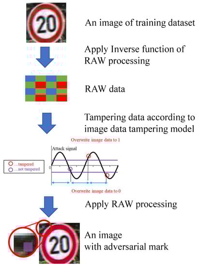 Images with adversarial marks (poison data) need to be generated to prepare the training datasets for the backdoor model. Figure 16 shows the flow of creating poison data in the simulation. The simulation model explained in the previous section was used for image generation. The RAW data were generated from color GTSRB images to simulate image tampering. Color images were converted to RAW data by applying the inverse function of RAW processing (black level correction, demosaic processing, white balance correction, color matrix correction, gamma correction). More specifically, the pixel value of the color of the RAW data was extracted from the color pixels as the inverse function of the demosaic process in this experiment. Then, the RAW data were tampered with on the basis of the image data tampering model, and RAW processing was performed to generate a color image.