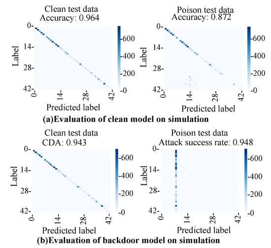 The clean model trained with clean training data was evaluated. Figure 18a shows the evaluation results of the clean model in the simulations with clean test data and poison test data. The accuracy on the clean test data was 96%, and the accuracy on the poison test data was 87%. The clean model achieved high accuracy with both test data. The model classified clean images into the correct class and can also classify poison images into the correct class. The accuracy of the poison test data (87%) was lower than that of the clean data (96%). As described in Section 5.1, the reverse processing of advanced demosaic processing cannot be calculated accurately in this experiment. As a result, the color tone of the poison image was slightly different from the test image, as shown in the input image and the generated image in Figure 16. It was assumed that the accuracy of the poison data decreased because the image and the color tone of the image slightly changed. Furthermore, it was assumed that the generated adversarial mark overlapped with the signboard in some images.
