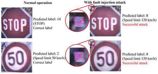 We compared the classification results with and without the fault injection attack. As shown in Figure 19, the experiments were conducted in two cases: one conducted normally and the other carried out with a fault injection attack on the MIPI. In total, 10 test images were used for each of the 43 classes of traffic signs. Figure 20 shows an example of the captured images with and without a fault injection attack on the GTSRB images. Under normal operation, the captured images were classified into the correct labels, namely Class 14 (stop) and Class 2 (speed limit 50 km/h). Meanwhile, under a fault injection attack, the captured images were classified into Class 8 (speed limit 120 km/h), which was the target class.