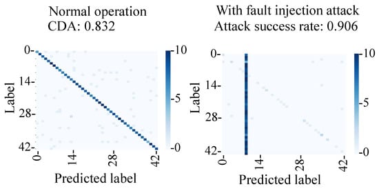 Figure 21 shows the confusion matrix of normal operation and the fault injection attack. Under normal operation, the captured images were classified into the correct classes with a CDA of 83%, which was lower than that of the simulation (95%). This was likely due to the change of the position and the brightness of the image captured in the experiment. On the other hand, the attack success rate during the fault injection attack was 91%, which is comparable to the 96% success rate in the simulation.