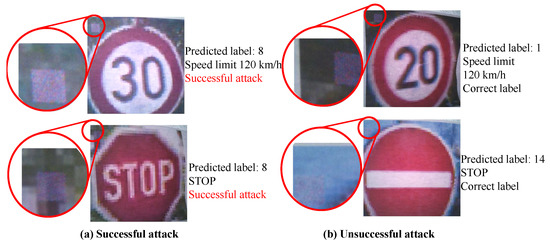 Examples of successful and unsuccessful attacks, their predicted labels, and expanded images of the tampered locations are shown in Figure 23. The position of the adversarial mark may not have been stable in the method of inputting the mark by taking pictures, and the success rate of the attack may have changed due to the shift in the position of the adversarial mark.
