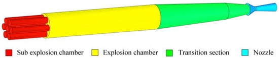 Figure 1 is a schematic of the computational model of the shock tube detailing. The shock tube is divided into four parts: sub explosion chambers, explosion chamber, transition section, and nozzle. The explosion chamber is 3 m in diameter and 20 m long. On the left end of the explosion chamber are seven sub explosion chambers. One of the sub explosion chambers is installed centered at the axis of the chamber. The remaining six sub explosion chambers are distributed in a circle at equal intervals. The depth of the sub explosion chambers is 5 m, the external diameter is 1 m, and the internal diameter is 0.8 m. The length of the transition section is 12.53 m. The nozzle length is 3.72 m, and the diameter of the outlet is 1 m.