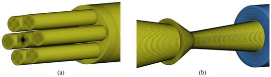 Schematic of computational mesh used in the shock tube simulations. (a) Sub explosion chambers. (b) Nozzle and outlet area.