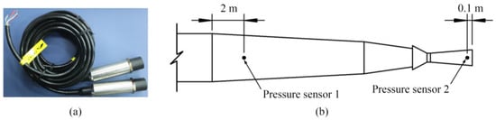As shown in Figure 5, two piezoresistive pressure sensors (CYG401F, Shuangqiao Sensor, Kunshan, China) were installed on the wall of the shock tube. One is in the transition section, which is 2 m from the explosion chamber exit. Another pressure sensor is in the nozzle, which is 0.1 m from the nozzle exit. There is a trigger wire connected between the detonator and measuring computer. The computer starts measuring before the detonation of the explosive. The detonation of the detonator causes the trigger wire to break, thus determining the moment of detonation. The high temperature and pressure gas generated by the explosion of the TNT charge expands and creates shock waves in the explosion chamber. The shock waves can form a relatively uniform wavefront after passing through the transition section, and then reach the exit through the nozzle.