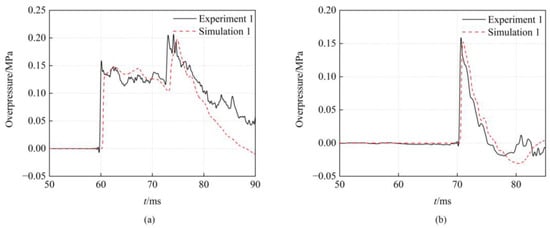 Comparison of the experiment and simulation. (a) Gauge 1. (b) Gauge 2.