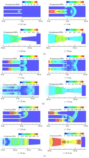 Figure 7 shows the overpressure cross-section contours of the shock tube with single-point detonation and multi-point detonation. The time of the first detonation is defined as the initial moment. After the explosion of the aggregate charge, a left explosion wave and a right explosion wave were formed in the central sub explosion chamber (Figure 7a). At 3 ms, the right shock wave reflected on the wall of the explosion chamber, and the pressure on the wall was rising rapidly. Due to the diameter of the nozzle inlet being greater than the diameter of the transition section, the shock wave was reflected on the wall of the nozzle contraction section at 65 ms and formed two shock waves to the upstream and downstream, respectively. In the end, the right shock wave reached the pressure sensor near the nozzle outlet at the time of 70 ms.