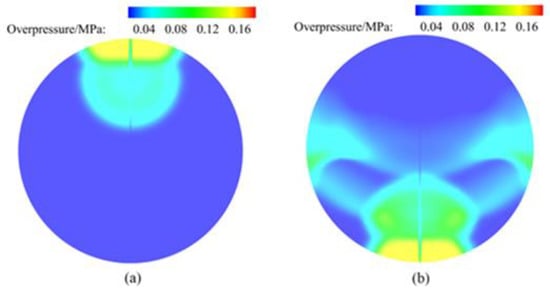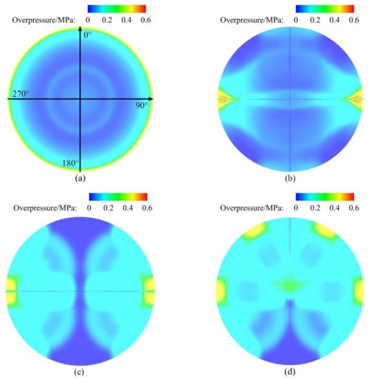 Figure 8 shows the overpressure contours of the explosion chamber for single-point initiation and multi-point simultaneous initiation. The profile is 1.5 m from the left end of the explosion chamber. As shown in Figure 8a, the axis of the explosion chamber is the origin, and the 0-degree angle is above it. The angle on the wall of the explosion chamber is determined with a clockwise rotation.