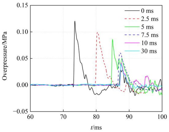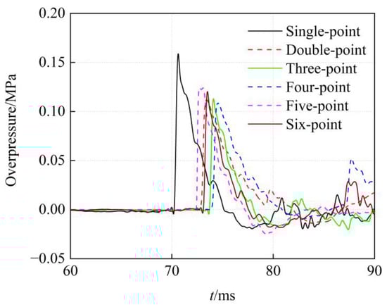 Overpressure time–history under the six-point delayed initiation with various initiation intervals.