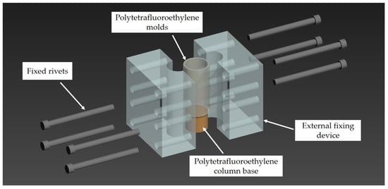 Epoxy resin, the polymer matrix of the composite material in this sensor, has a very high bonding strength, which makes it difficult to de-mold if a metal mold is used. However, epoxy resin does not have such a high bond strength for Teflon-type materials, so it is easy to de-mold. In addition, epoxy-resin-based smart materials are viscous-fluid before curing, and smart devices with certain structural characteristics can be prepared by integrated casting in the mold. After indoor tests to fully verify the molding effect and ease of de-molding of the smart material, the preferred smart material molding inner mold was determined to be a Teflon tube (14 mm high, 20 mm diameter) with the bottom end sealed by a Teflon cylindrical plug. The conductors are inserted inside the mold through the top and bottom through-holes and buried inside the material with smart material curing. In addition, in order to prevent the Teflon tube from shifting after the material is poured and while waiting for the epoxy resin to cure, resulting in changes in sensor size and form, the Teflon tube is supported on the outside by two semicircular arc fixing brackets and is fixed in the middle using rivets. The overall design of the mold is shown in Figure 1. The smart materials and the mold are placed in the oven after the casting is completed, and the sample is de-molded after curing at 80 °C for 2 h to produce the smart materials’ inner core of the axle load sensor. By enlarging the inner diameter of the mold and following the same casting method, an epoxy resin/anhydride system was poured around the smart materials’ inner core as a polymer encapsulation structure, thus significantly improving the high-temperature resistance and reducing the humidity sensitivity of the sensor.