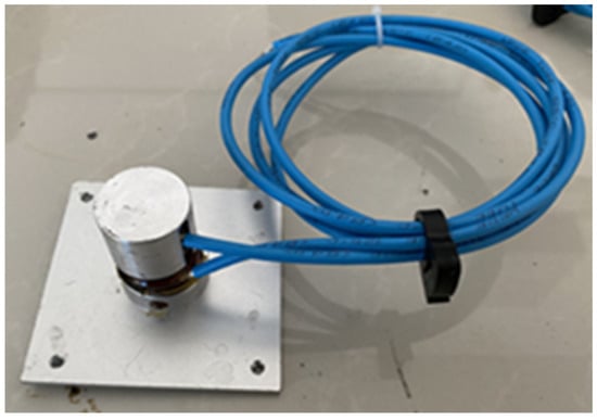 To ensure the viability of the cylindrical smart sensor, a protective cap for the metal encapsulation of the sensor is designed. The cap is bonded to the sensor through the top surface only, and the inner diameter is larger than the outer diameter of the sensor. This structure can effectively protect the piezoresistive sensor, does not limit the lateral deformation of the sensor, and will not affect the monitoring accuracy. At the same time, considering the influence of the lower support of the axle load sensor on the monitoring stability, a square enlarged base with a side length of 7 cm is designed. The sensor with the added protective cap cover and base is shown in Figure 2.