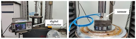 In order to investigate the stress–electrical response law of piezoresistive sensors of composite smart materials, the stress–electrical response of the sensor is calibrated by using a universal testing machine. The peak load is set to 15 kN, the preload force is set to 10 N when loading, and the loading starts from 0 kN according to a certain loading rate, which can cover the vehicle overload of 400% according to the standard load of 0.7 MPa to verify the change law of sensor resistance response under different loading forces. Additionally, changing the magnitude of the loading rate can be used to explore the effect of different loading rates on the stress–electrical response law of the sensor (the loading rates are 20 N/s, 80 N/s, 140 N/s, 200 N/s, 260 N/s)