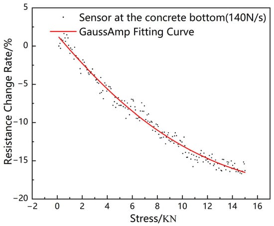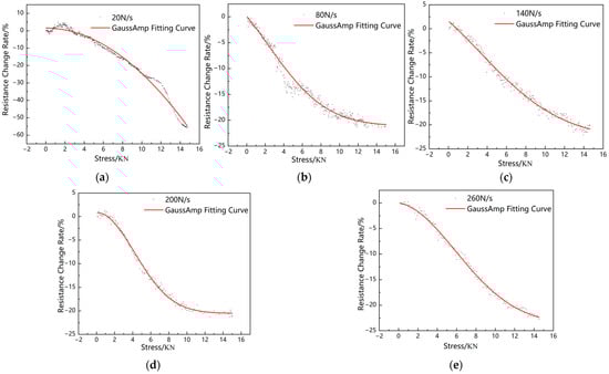 As shown in Figure 3, the sensor resistance signal is recorded throughout the loading process by KEITHLEY DAQ6510 digital multimeter. According to the loading of the MTS tester, when the loading force reaches 100 N, the sensor starts to show resistance changes; when the loading force reaches 15 kN, the sensor resistance changes gradually tend to slow down, indicating that the upper and lower limits of the load monitored by the sensor are 15 kN and 100 N, respectively. Figure 4 shows the stress–resistance response at different loading rates. It can be seen in the figure that the data of the axle load sensor based on the composite smart material have a large dispersion and exhibit randomness at lower loading rates. However, as the loading rate increases, the dispersion of the data gradually decreases and tends to a stable negative correlation. When the loading rate is small, the data are more dispersed, and as the loading rate increases, the dispersion of the data decreases. Smaller loading rates take more time to load to a given load than larger loading rates, and there is a certain creep effect on the material inside the sensor that affects the subsequent loading and, therefore, a greater dispersion of data. As the loading rate increases, the creeping effect of the above materials mentioned decreases, and the dispersion of the data decreases. When the loading rate is greater than 140 N/s, the data fit is greater. Obviously, the loading rate of the vehicle axle load acting on the road is greater than this rate. Therefore, the sensor can maintain stable sensing characteristics when used to monitor the road axle load. By performing a nonlinear fit to the images for loading rates of 140 N/s and above, the results show that the fitted response curve conforms to the GaussAmp formula [,,], and the fitted curve expression is
