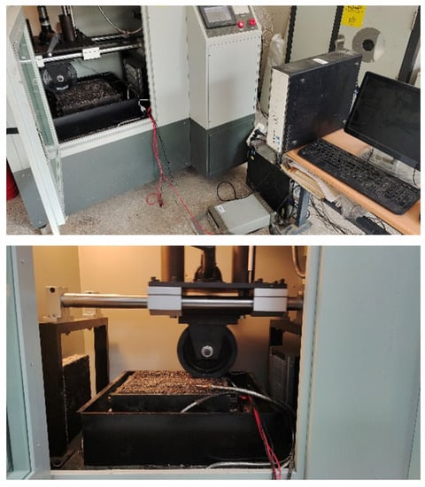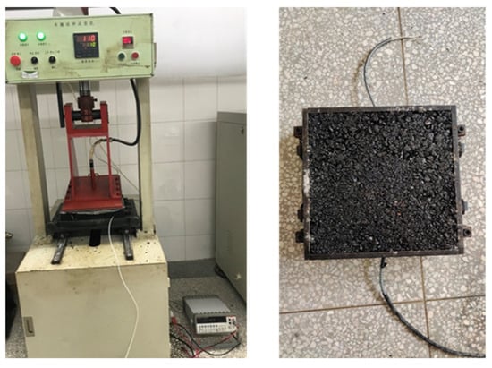 The rutting apparatus was used to simulate the traveling load and to investigate the load-electric response law of the developed sensor under the traveling wheel load. The test parameters were set according to the relevant specifications for asphalt mixture rutting tests in China (JTG E20-2011-T 0719-2011). As shown in Figure 8, the temperature of the asphalt concrete specimen with the embedded sensor was stabilized at 60 ± 0.5 °C during the test, and the test wheel travel track was located directly above the sensor in the rutting slab. Three parallel experiments were conducted, and the average of the three groups was taken for performance analysis.